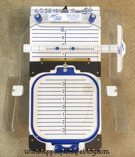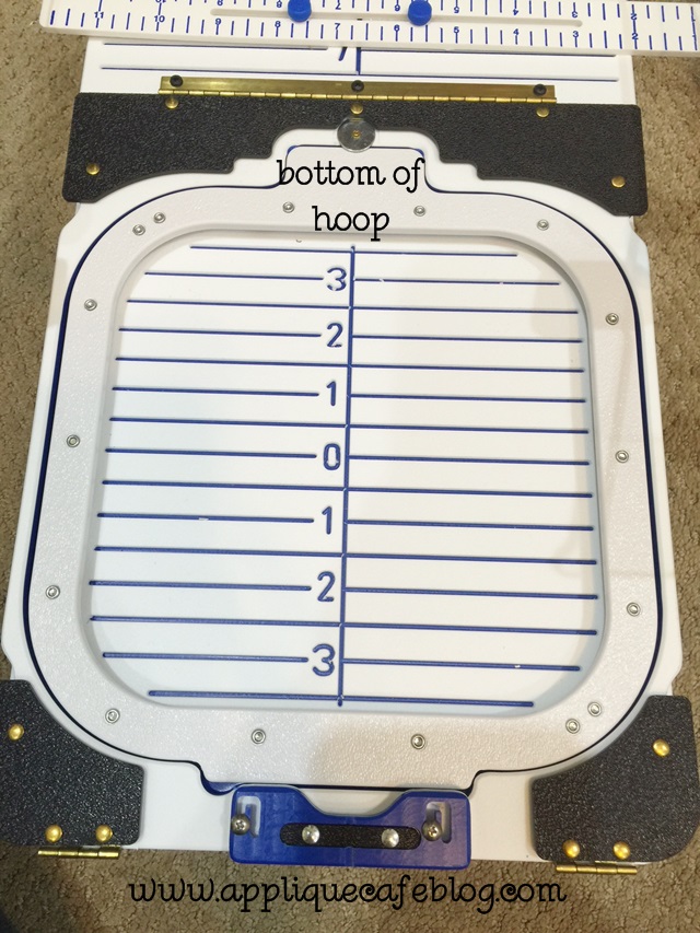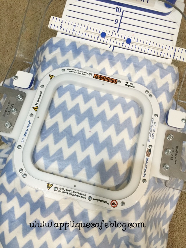 I pressed down on the top hoop/clear arms and the top of the hoop snaps to the bottom of my hoop because of the MAGNETS in the hoop. You can also see my center mark on the blanket is centered in the hoop below. You can also see closer that the edge of my blanket is lined up with the 6.5″ line on the fixture. If I wanted the monogram centered 10″ from the edge, I would line the edge of the blanket up with the 10″ line.
