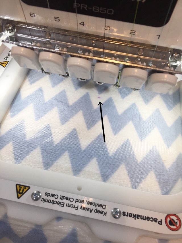 Below is the hoop on my machine, and as you can see, my center dot is already lined up with needle because my blanket is hooped (almost) perfectly centered!
