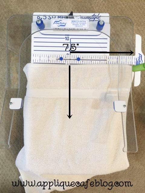 Here is a hand towel and maybe this will help with the T-bar explanation. (From the HoopMaster website: “The T-square is to assist you in measuring the horizontal distance from the edge of a garment to where the center of a logo is to be embroidered.”) The hand towel is 15″ wide, so if you adjust the T-bar to line up the center of the fixture with the 7.5″ mark ON the T-bar, your towel will be centered if you line up the corner on the right where the T is. I didn’t have any way to hold it AND take a picture, so I used a clip. I know this is hard to understand!! Trust me… if I had 15 hand towels to do, this would REALLY come in handy! No measuring tape and marking the center. It’s all done on the fixture!