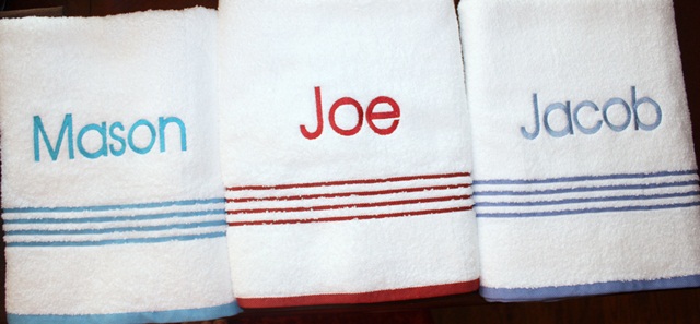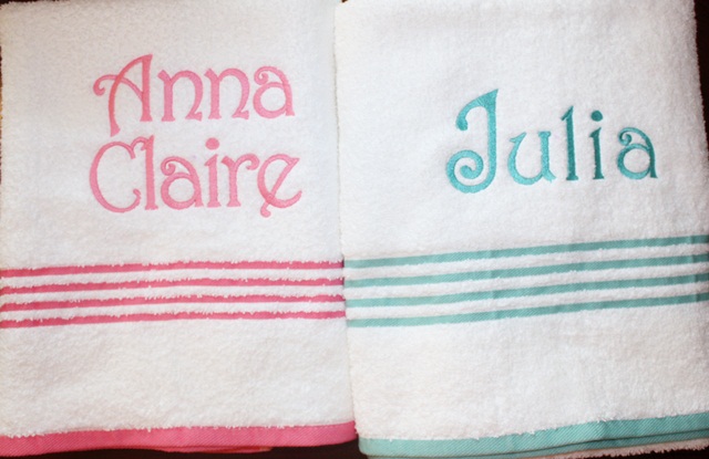Last week I monogrammed the 7 towels pictured below. They came from WALMART and are sold individually in the store (for probably pretty cheap!). I did these for a friend who was heading to the beach with her family and wanted monogrammed towels for all of the grandkids (and for her and G-Dad). I think G-Dad is the cutest grandfather name! Anyway, I did the boy towels in Atilla (Monogram Wizard Plus) and the girl towels in Curly Q (with the exception of the J in Julia which is Uniblock; ulia is Curly Q). I thought they turned out cute and when I mentioned doing them on Facebook (along with 8 pillowcases that I didn’t take pics of), I had several comments on monogramming towels!
