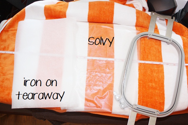 Here are the stabilizers I use for doing towels (and blankets, terry bibs, furry stuff, etc) ~ Iron on Tearaway Stabilizer (this is Sulky brand) and Solvy (also Sulky).