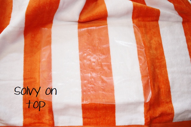 I have been using Glad Press n Seal on top of my towels before monogramming. Works great, just easily peels off. Parchment paper for underneath. Money savers!