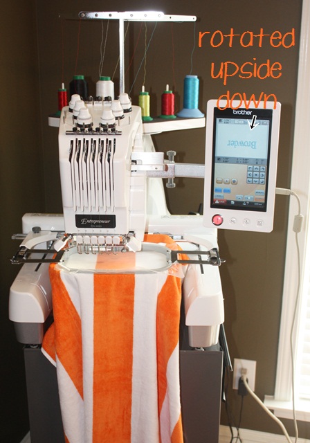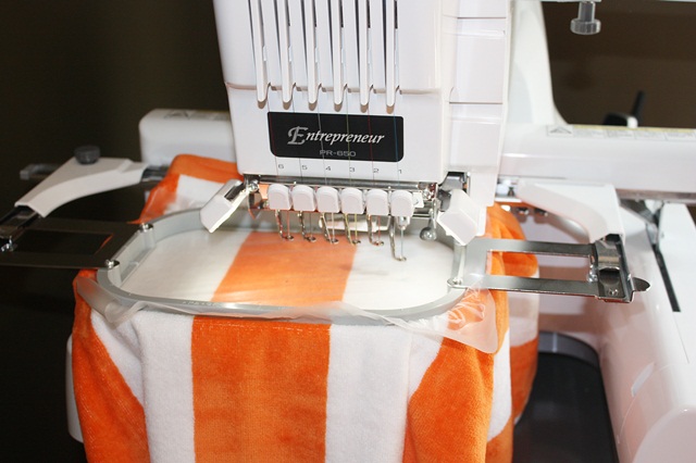 Since my machine is on a tool chest and not a stand, I put my hooped towel on my machine so that the excess hangs down in front. If this were a heavy blanket, I might let it rest on a chair in front of the stand. Since my towel is technically upside down, I rotated my name so that it sews right!