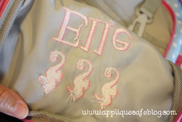 I have sewn my design, which is our Mini Seahorse Embroidery Design X 3 and “Elle” done in Monogram Wizard Plus “Library” font. The design fit well within my pins with room to spare.