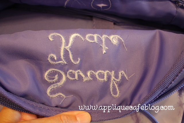 I am now ready to stick my backpack front pocket to the sticky-stabilized-fast-frame. As you can see below, the backpack pocket flap is “stuck” to the sticky stabilizer, but I also pin it in place INSIDE the inner frame of the fast frame. This keeps the backpack in place AND it shows me where my inside borders are. If my monogram goes outside the pins, it is likely to hit the frame which is NOT good. So… stay within the pins! As you can see below my center mark is not exactly in the center of the frame, but it’s close and I will have plenty of room for my monogram. You just need to make sure it’s straight on the frame!