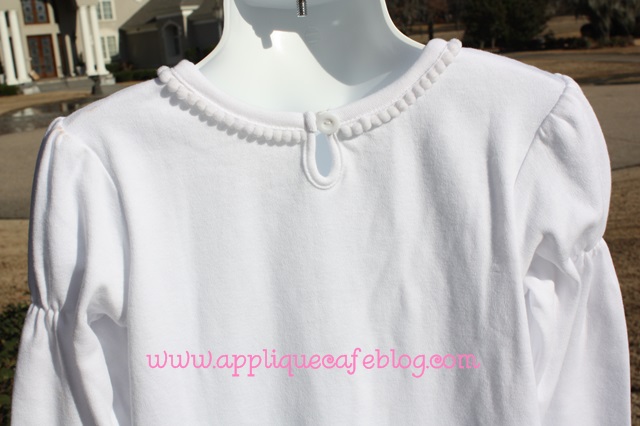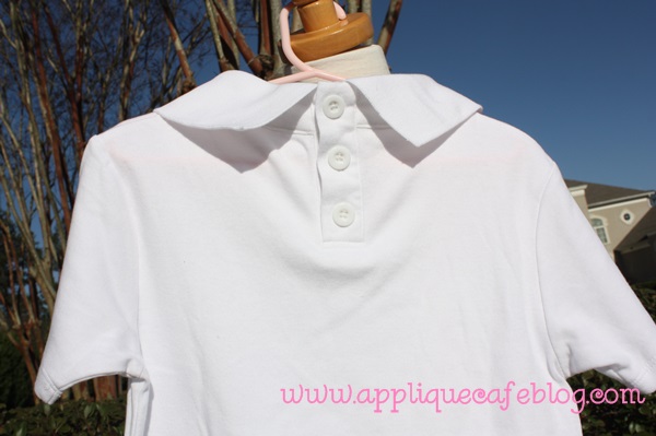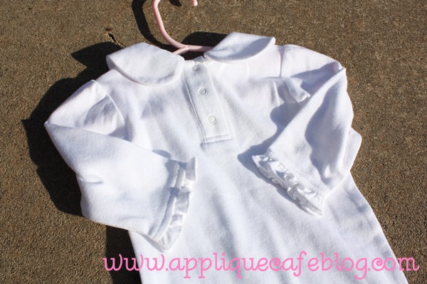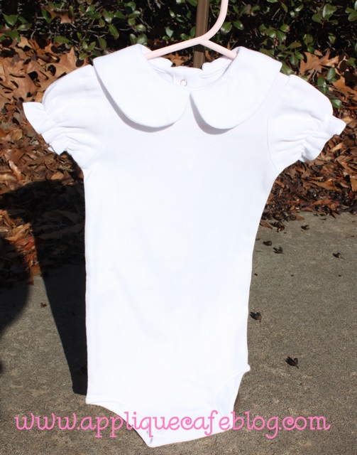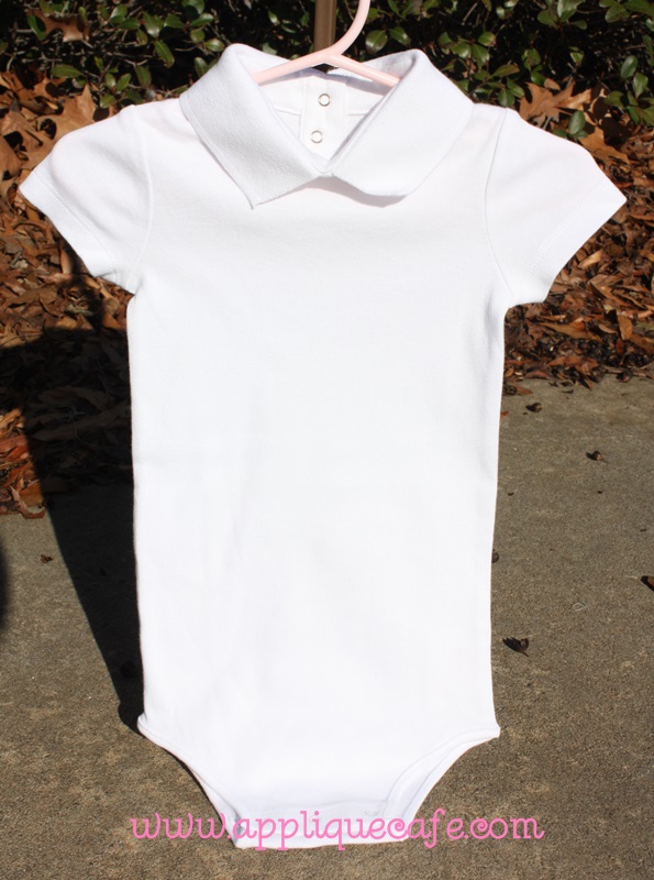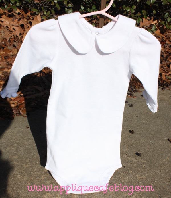 This is Whale 4 stitched on a Blanks Boutique onesie. Their onesies snap up the back, which makes it super easy to monogram and applique! I was able to get a 5×7 design on this onesie.