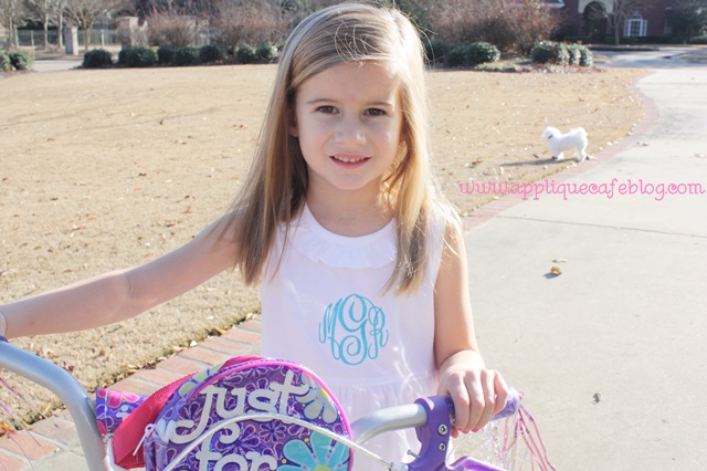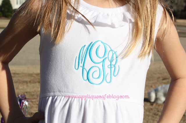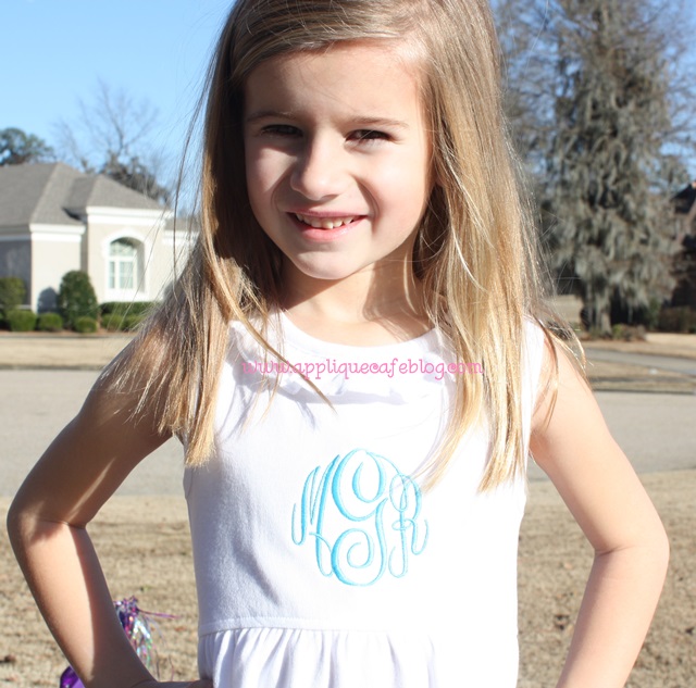 More monogrammed and appliqued items! I am obsessed with the colors in this bag!! It’s a coral-y peach color monogram (Monogram Wizard Plus “Master Circle” font) on a “spa” colored jute bag, which came from a local store that I do monogramming for. The towel and bag were both Mother’s Day gifts for my mom! 🙂