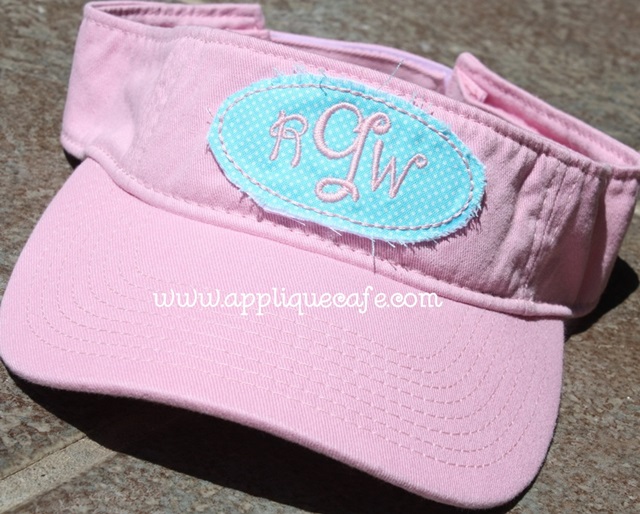 This is our new Mini Raggy Oval Patch, which can be sewn on anything. I typically use a layer of flannel (white or any color) underneath my fabric for raggy designs. You simply trim, leaving about 1/8″ around (give or take) and then scrape with your scissors to create the raggy effect. For this VISOR, I stitched the patch on a medium weight tearaway stabilizer. I hooped the stabilizer, then sewed the patch on to it just like any applique (fabric + white flannel). I then trimmed around the patch, pulled away the stabilizer and glued it to the visor using Fabric Fusion fabric glue. You could also stitch this on using a cap frame/cap hoop if you have a multi needle machine.
