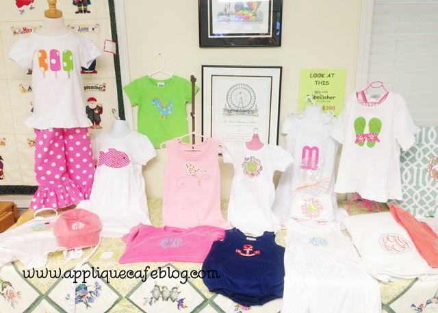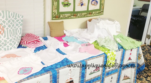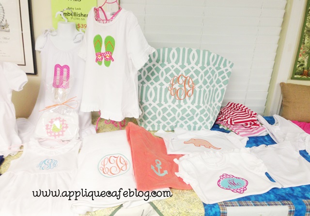 Good afternoon! We are counting down to Summer around here! My kids get out of school next Friday, May 23rd! A couple of weeks ago I made the trip down to Ruthie’s Notions in Baker, Florida to teach a Basics of Applique class (my usual topic). I was there for 2 days, and managed to snap 3 whole pictures. Below are some samples that I have sewn (or appliqued or monogrammed) and took to show. Everyone just LOVED all of the blanks! These are all Applique Cafe designs of course. I believe all of the monogramming is Monogram Wizard Plus “Master Circle” font.