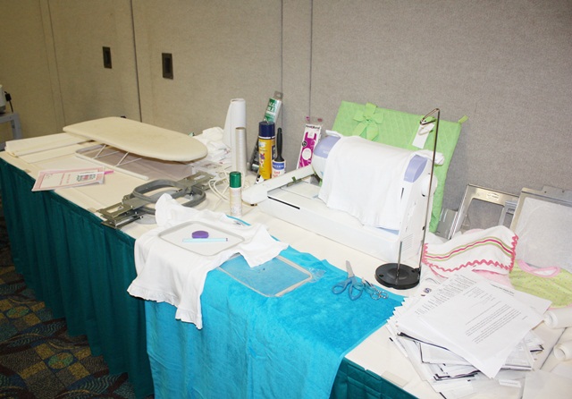 The only thing about the conference that I would change is that I would have LOVED to sit in on the other classes! I’ve heard such great reviews on the Photography and Marketing class! We all know I could use some help on photography!! Here are some pics from our class (Applique the Right Way). First of all, please notice I am holding a m-i-c-r-o-p-h-o-n-e. Those of you who know me know that I am relatively quiet and this is so out of character for me. But, we were forced to use it by the first class. We taught 4 classes total ~ the intermediate classes were over 200 folks each. Here I am discussing spray adhesive.