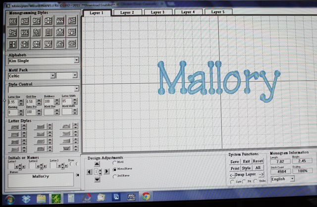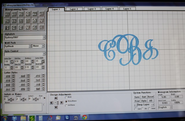 2) Monogram Wizard Plus!! I’ve sold 2 this week, so a couple of people are getting new font software for Christmas! There is an actual installation CD for MWP which is shipped to you. I usually mail same day, so it will arrive in your mailbox within 2-3 days (we ship USPS Priority Mail). If you are new to embroidery and are frustrated with the fonts that came on your machine, or with merging letters together, then check out MWP! It’s a GREAT investment for your embroidery business. Below is an example of your screen and it’s super easy to use!