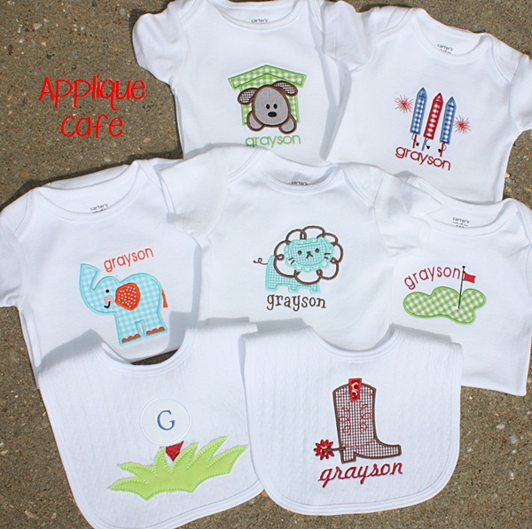 The boys had Art Camp this morning and my inlaws took Mallory for the morning too. They didn’t come home til 2:00 so I was able to WORK (for a change) and got all of the below done (with a lunch break to Mama G’s and Nancy’s). These are all Applique Cafe designs and I did all of the onesies using my 4×4 hoop. I did use a 5×7 hoop on the bibs. The lion font is Tipsy (monogram wizard plus font) and the others are done in MWP Atilla. Some I made skinnier and the golf green I curved the name. The cowboy boot bib is MWP Simple Script which looks cowboy-ish to me!