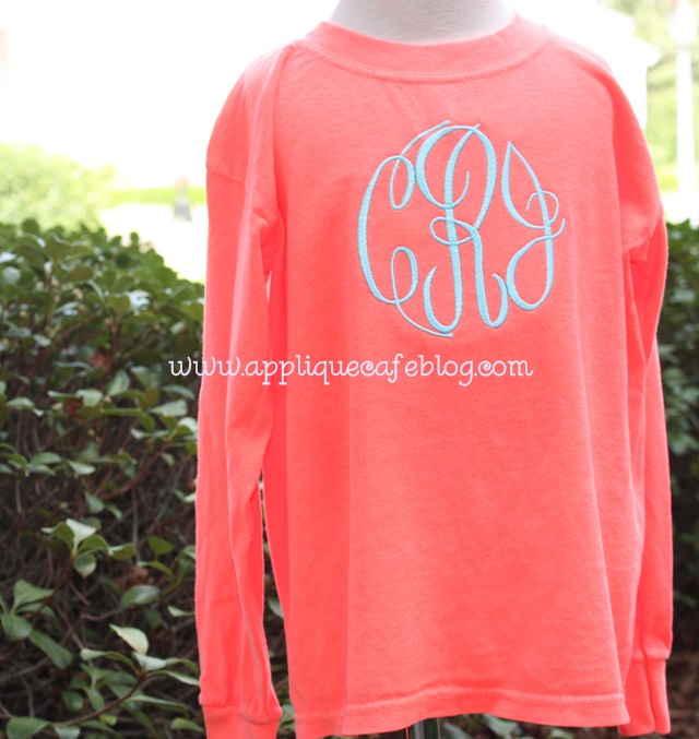 Another item I just got and LOVE – see below! This is a Comfort Colors long sleeved t-shirt from Apparel N Bags also. The color is Neon Red Orange, and when I first got it I had no idea what I was going to do with it. I dug through my fabric bins and honestly didn’t have ANY neon fabric to match for an applique. So… I decided to go with a classic monogram. This is Monogram Wizard Plus “Master Circle”, which is my GO-TO monogram font for like everything under the sun for girls. After much debate on thread colors, I went with Isacord #4240 which is a pretty blue color. My monogram is 4.88″ X 4.96″ so kind of big. This is a YXS sized shirt, and believe me, the color is NEON! I love the colors together and am happy with the way it turned out!