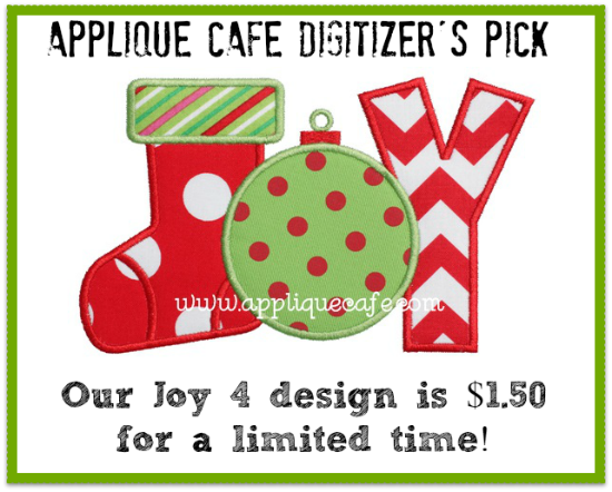 Have you visited Applique Cafe recently?? If so, you may have noticed our “Digitzer’s Pick” on our home page! We now have like 800+ designs on our website! So…. we thought it might be a great idea to showcase some of our older designs so you don’t forget about them! Our PICK right now is actually a design from last year I think, but it was too cute not to *pick*!! Click HERE to check out our Joy 4 design! The way it works is that we will randomly pick a design to showcase and feature it on our home page. We might leave it up there for a week, or it may be 3 days. I didn’t want to set a schedule (like a design of the week) because we all know how busy everyone is and how forgetful I am and I wanted to be able to change it out when I have time and feel like it! We hope you enjoy our PICKS! p.s. I am working on a cute graphic to feature the chosen designs on for my website! For now you get my Pic Monkey graphics.