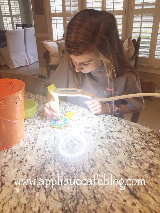 I, of course, have used my lamp all over my sewing room the past couple of weeks doing embroidery and machine maintenance. My daughter borrowed it also to do a little crafting with her perler beads. It clamped on to our kitchen counter easily and the lamp is small enough that it’s easy to move around the house.