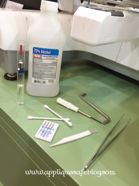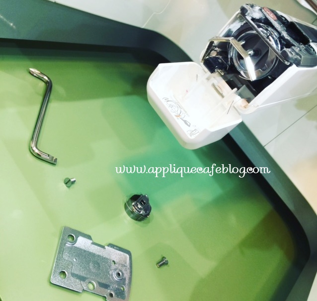 Here are the tools needed. If you have a multi needle, they came with your machine. I also use alcohol and Q-tips to get the gunk! I’m a couple of needles short to change out my 6, so heading to Joann at some point today so I can change them all. I use Schmetz 75/11 Embroidery Needles.