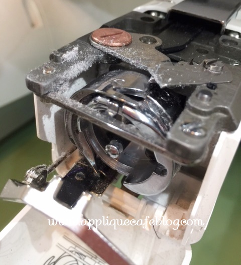 Take the plate off the bobbin case area to really get inside the bobbin case. When all clean, screw it back on tightly.