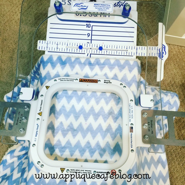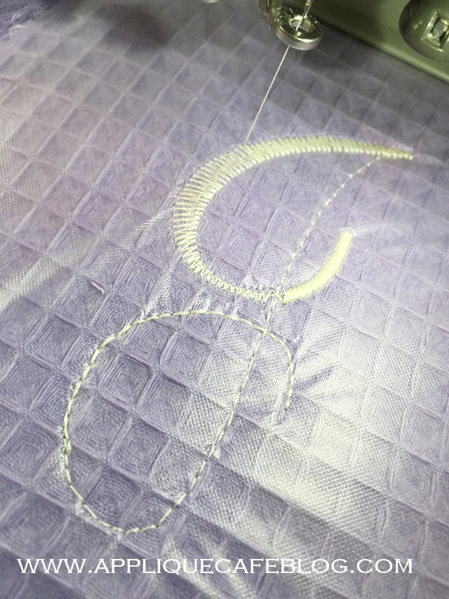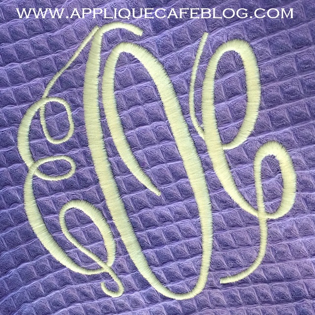 Back in February I did a blog post reviewing a Craftsy class I did on monogramming textured items. You can go back and review it HERE if you missed it! Today I’m monogramming 7 lavender waffle weave short robes which are bridesmaids’ gifts. If you’ve ever monogrammed waffle weave, you know that sometimes your monogram can turn out a little “waffley”. Yes, all those little squares can show up in your monogram. I’ve done it in the past and ended up running the monogram twice just to get a pretty result. One thing I learned in the Craftsy class I mentioned on monogramming textured items (terry cloth, towels, waffle weave, etc.) is that it’s best to 1) use a water soluble topper on top and 2) apply an underlay stitch underneath your monogram. I use Monogram Wizard Plus (Master Circle font shown) and there is an option to add underlay, which is extra stitching beneath your letters which helps the monogram stay on top of the texture and turn out pretty! It takes a little longer (these are averaging 18 minutes each at 4.25″ tall) but the result is worth it. Adding underlay adds a few thousand stitches to my particular monograms. Note: I used a waffle weave tearaway stabilizer on bottom.