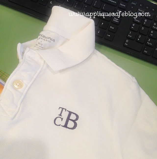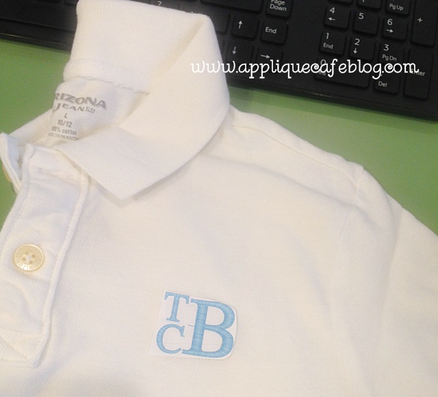 I’ve done several “polo” type shirts this week, so I formatted the monogram in MWP as best as I could (meaning I guessed on size), then printed a copy of it and cut it out to lay on the shirt. This helps me to see if my size is right, and it also helps with placement! Sorry these pics are a little fuzzy. I guess all the rain has my camera fogged up.