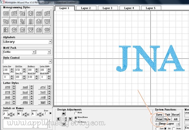 I’m also doing 5 towels for graduation gifts. These are for guys going off to college, so we decided to do their initials straight across and I used MWP “Library” font. I wanted to make sure this was going to look right, so I guestimated the size of the initials and printed it so I could make sure it would look right.