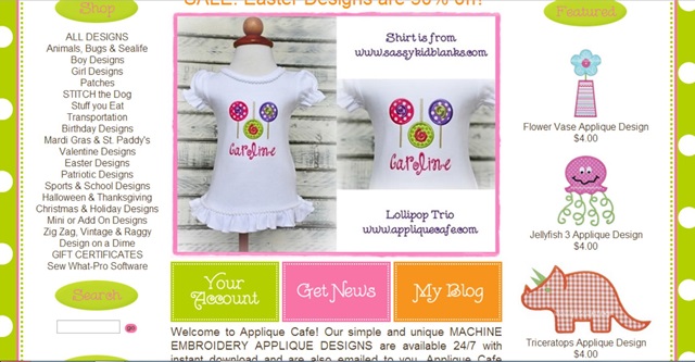 Have you noticed anything new on Applique Cafe? Yes, Easter designs are 1/2 off! There are also a few new buttons on my website. I am constantly looking over my website and making sure it’s as user friendly as possible, and not confusing, and “neat” looking. Like my designs, I like to keep things SIMPLE. I added a few buttons to help better navigate to those important areas ~ YOUR ACCOUNT (your purchases saved under your email address), GET NEWS (subscribe to our newsletter which goes out usually once per month with new design and sale info) and of course MY BLOG! That’s where you are now! Check it out!