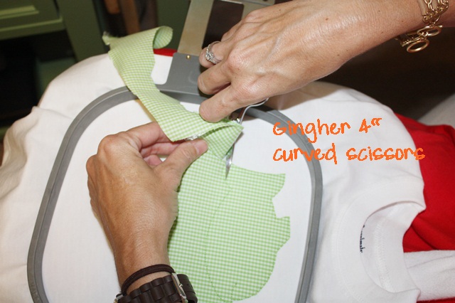 I peel the sticky stabilizer/fast frame off the flap and as you can see it leaves a little inside the letters. You can peel that away easily. Get under it w/ scissors if need be. The sewingmachine.com sticky stabilizer is just sticky enough and comes off great!