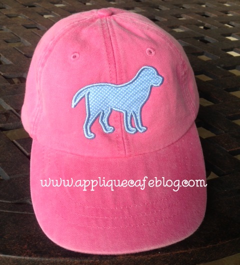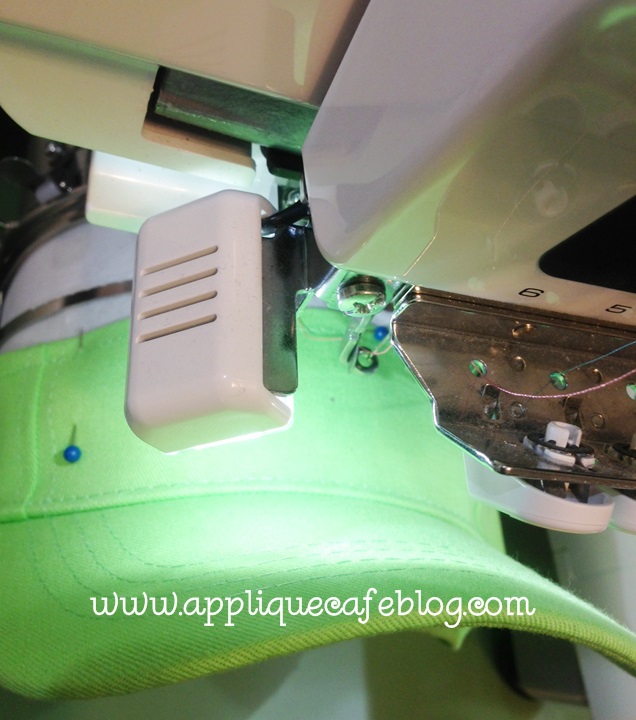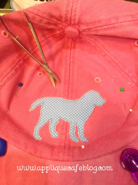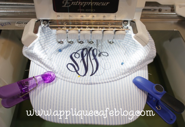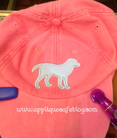 This week we listed a new Mini Dog Applique AKA “Stitch” so I sampled it on a hat as well. It was a little trickier because I had to trim around the small legs of the dog. I typically use Gingher 4″ curved scissors to trim my appliques, but busted out the “Snips” for this hat. I used my 5.5″ X 6″ Fast Frame + sticky stabilizer and pinned the front of my hat to the frame. I use the seam on the front of the hat for my center and it’s best to get the front of the hat as flat as possible and pinned down securely. I also use chip clips to clip the bill of the hat (which is flattened) to the frame.
