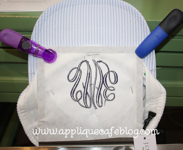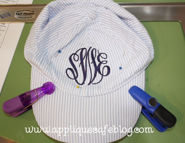 More hats. These cute seersucker striped hats came from the J. Crew Outlet and were about 6 bucks each. My sister in law bought all they had and I have 3 more to do today. Again, flatten the bill, chip clip it to the fast frame and smooth and pin the front of the hat.