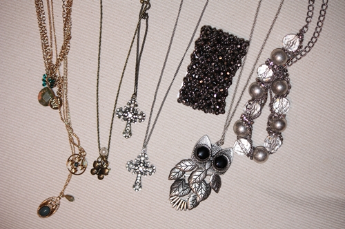 My birthday was in September and Jeff & I were supposed to go on a mini trip to Reynold’s Plantation in Georgia. Busy-ness thwarted our plans (I opted out due to our heavy schedule) so we rescheduled and went to ATLANTA this week to shop and spend the night! It was a great little 36 hour trip! Monday I shopped ~ we had no plans other than finding a Forever 21 store which we found at Perimeter Mall. I had visited this store once before on another Georgia trip and wanted to go back. I am FAR from 21, but they have a HUGE store (like 4 stores) in Perimeter Mall and Jeff so kindly sat outside on a bench while I shopped! I got several cute sweaters and racked up on costume jewelry!! Sometimes you just need a fun necklace to throw on with that plain black top. Most of the below were BELOW $8!! The cross necklaces were like $4.80. Most everything in the store is very reasonable and unique!