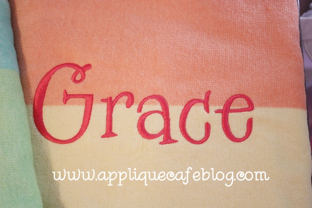 You know how I always say I like to use FILL STITCH when I do towels? Well, I have an exception to the rule. I had a customer bring me these beach towels to monogram, and she specifically said “nothing too thick”. These are from Tarjet I think, and they are cute little towels and also relatively thin. In this case, I DID NOT use fill stitch. I made sure my font was thin enough to do satin stitch. These names pretty much filled the 5×7 hoop, so close to 6.5-7″ wide. In Monogram Wizard Plus you can adjust the boldness (thickness or fatness of the satin stitch) of a font so I did decrease the boldness on the right 2 girl towels. The font is MWP Specs. On the left boy towel, I used MWP Kazoo font and the name wasn’t too thick at this size, so I don’t think I had to adjust the boldness on it. If this is all confusing to you, stay tuned for my next post on Monogram Wizard Plus and adjusting a font’s width and boldness and all that good stuff.