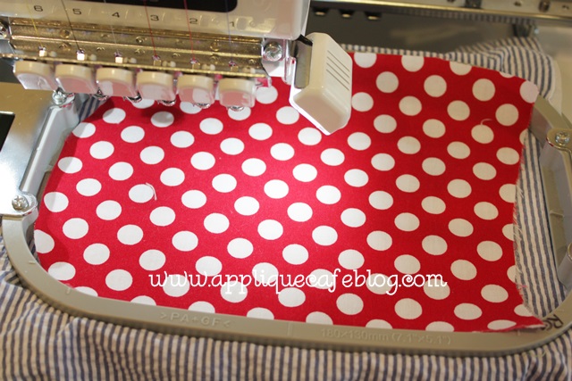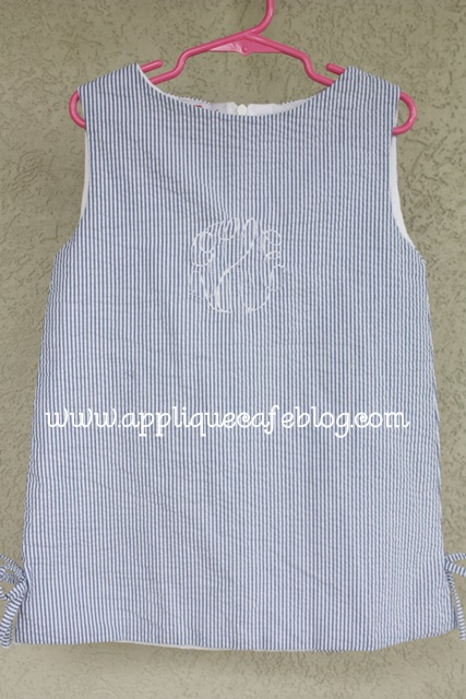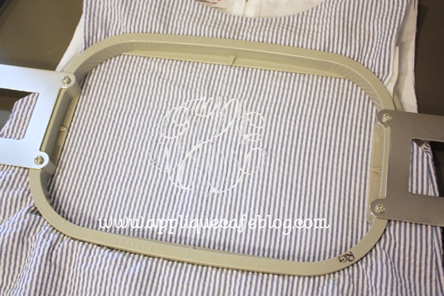 I used medium cutaway stabilizer on the back side of the dress and hooped it so that the monogram was pretty centered in the hoop. You want to make sure the applique will cover the entire monogram.