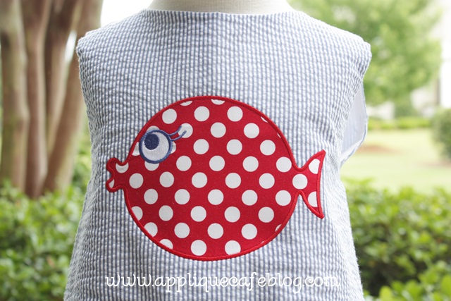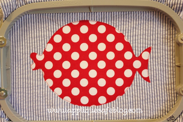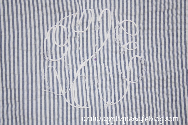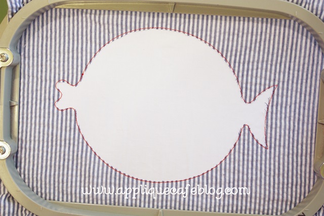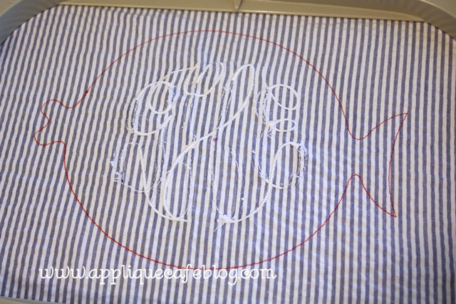 I chose our Fat Fish Design to cover the monogram. As you can see below, I sewed the marking stitch first. I then had an idea… what if I cut out the seersucker fabric and monogram INSIDE the marking stitch LEAVING the lining in tact. Had I thought of this before, I would not have wasted 20 minutes trying to take out part of the monogram. See my post on Layering Fabrics in an Applique for more info on this.