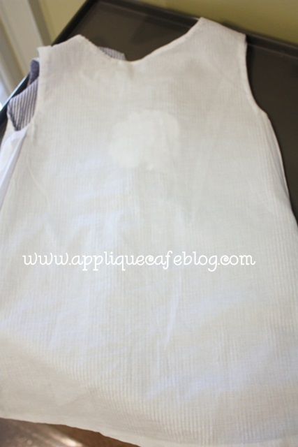As you can see below, I took out what I could of the monogram ~ mainly the fat parts that I could easily cut (with a seam ripper or small scissors) and pull out. The dress/shirt was fully lined, so I didn’t have access to the back side and bobbin thread and could only take out the monogram from the front which was a little tricky. Anyway, I took out what I could and decided to move on. You can also see where I marked the approximate center of the monogram. My plan was to cover it with an applique!