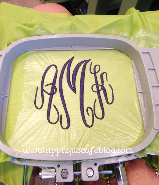 This is what it looked like when I was done. I did 3, so these pictures have different initials on them. I removed the hoop and stabilizer from both sides, including inside the letters.