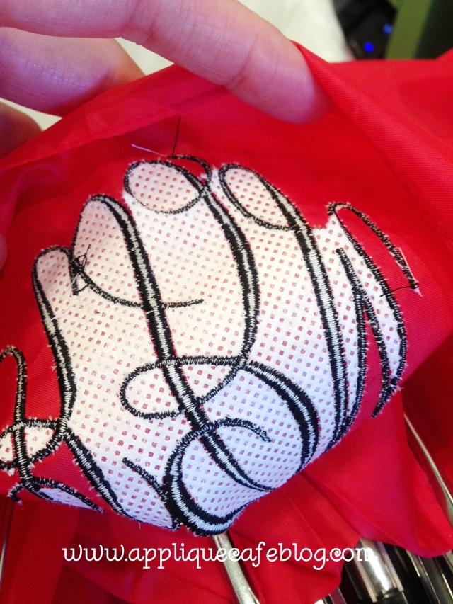 I have never used that waffle backing but if you want to avoid hooping I always use sticky backing and fast frames with my umbrellas. I also use binder clips to make sure the umbrella doesn’t slip at all and the clips hold down my solvy topper as well. I haven’t ever had a problem peeling the backing off inside the umbrella. It looks like your method works great as well, but if you want to save some time and not hoop the fast frames are great 🙂