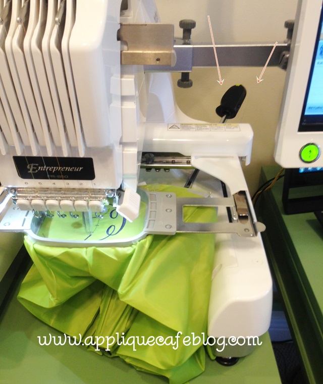 My hat is on the machine now ready to sew. Just make sure the excess hat is out of the way on all sides! Also, since this is a FAST FRAME and my machine doesn’t recognize it as any particular hoop, I checked my borders to make sure my monogram would fit INSIDE the area on the face of the hat. You don’t want your needle to hit the frame on either side!! I lined my lead needle up with the center seam on the hat.