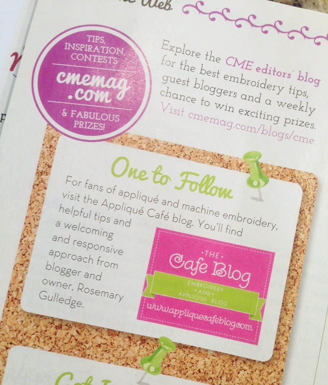 Good afternoon friends! Yesterday I opened the mail to find a copy of Creative Machine Embroidery magazine and was pleased to find that my BLOG was noted in the magazine as “One to Follow“!! While sometimes I struggle to find the time to blog, or struggle to come up with anything to blog about, it has always been my passion to share what I’ve learned with all of you! I know sometimes it’s boring (WAKE UP!!!) and sometimes I go a month 2 weeks with nothing posted, but please know I’m here and hope to bring you helpful info as often as I can!! Thanks for reading and thanks for the comments and encouragement! 😉