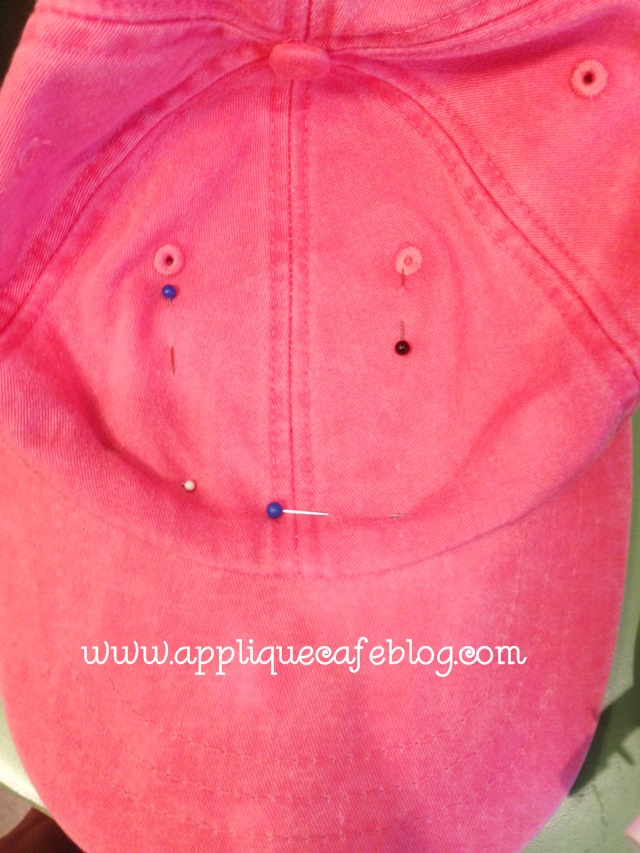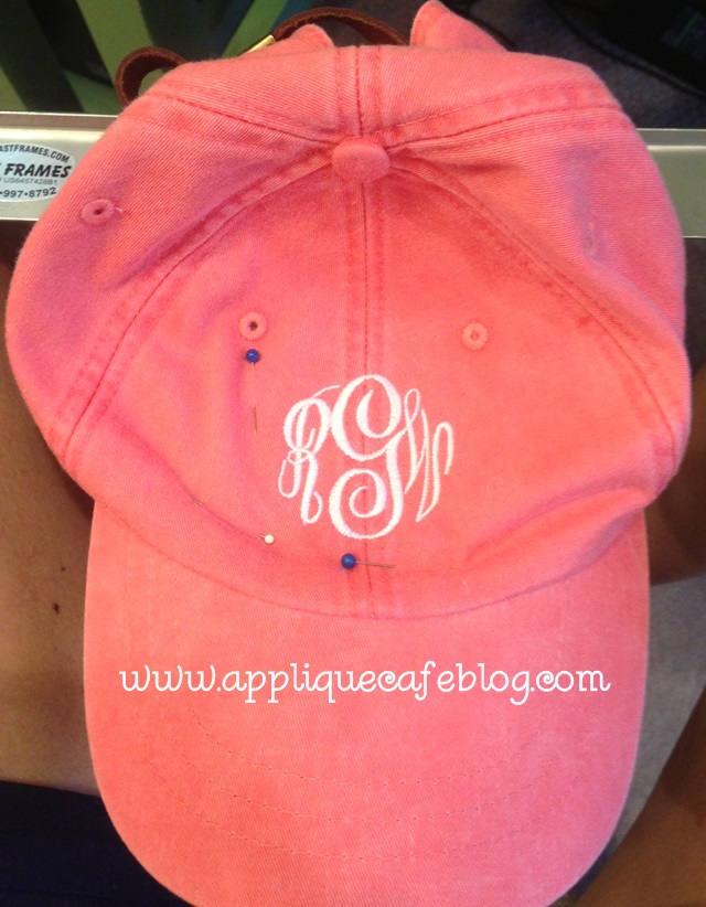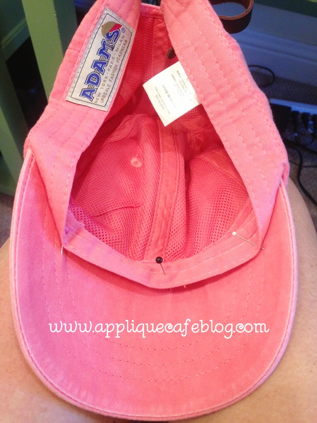 The first thing I did was get the liner out of the way so I don’t monogram it. I simply pinned it out of the way! As you can see, this is one of those cute “pigment dyed” hats that are so popular right now (like the Comfort Colors tees). It’s ADAMS brand and I got this from a friend, but have recently discovered Apparel N Bags website where you can buy the Comfort Colors tees, these hats and other cute things!