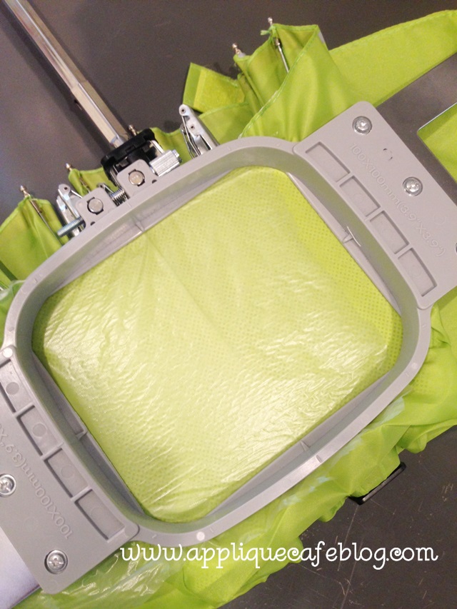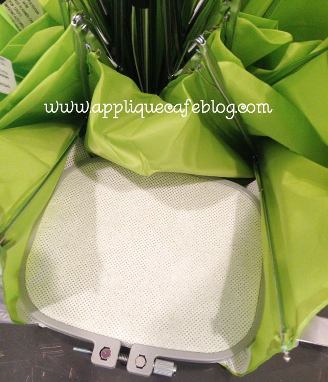 Also this week, I monogrammed a few UMBRELLAS! EEEekkkk!! Scary I know! They were really pretty easy to do and I took pictures along the way! First of all, I did use my 4×4 hoop as opposed to fast frames. The material of an umbrella is so thin that I was afraid sticky stabilizer would not come off easily or cause the umbrella fabric to tear in the process of removing it. I used waffle tearaway and water soluble “solvy” stabilizer on top.